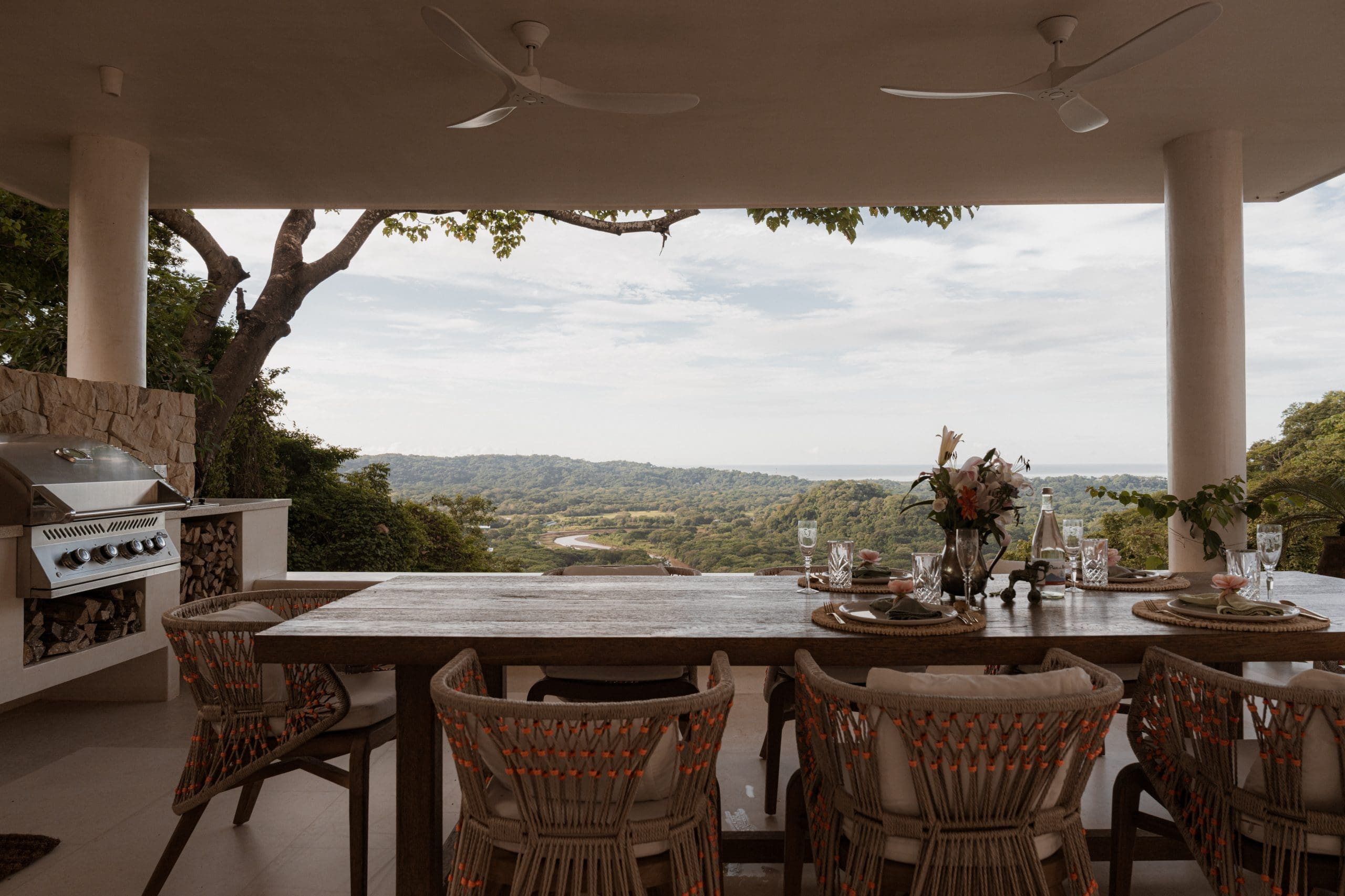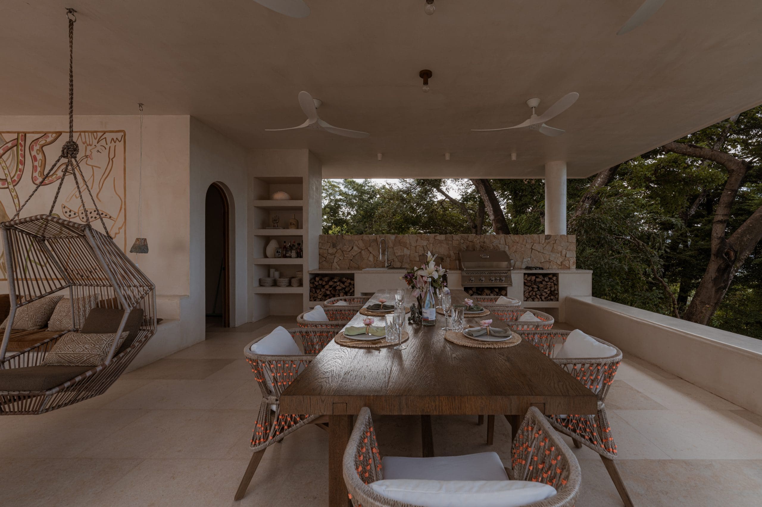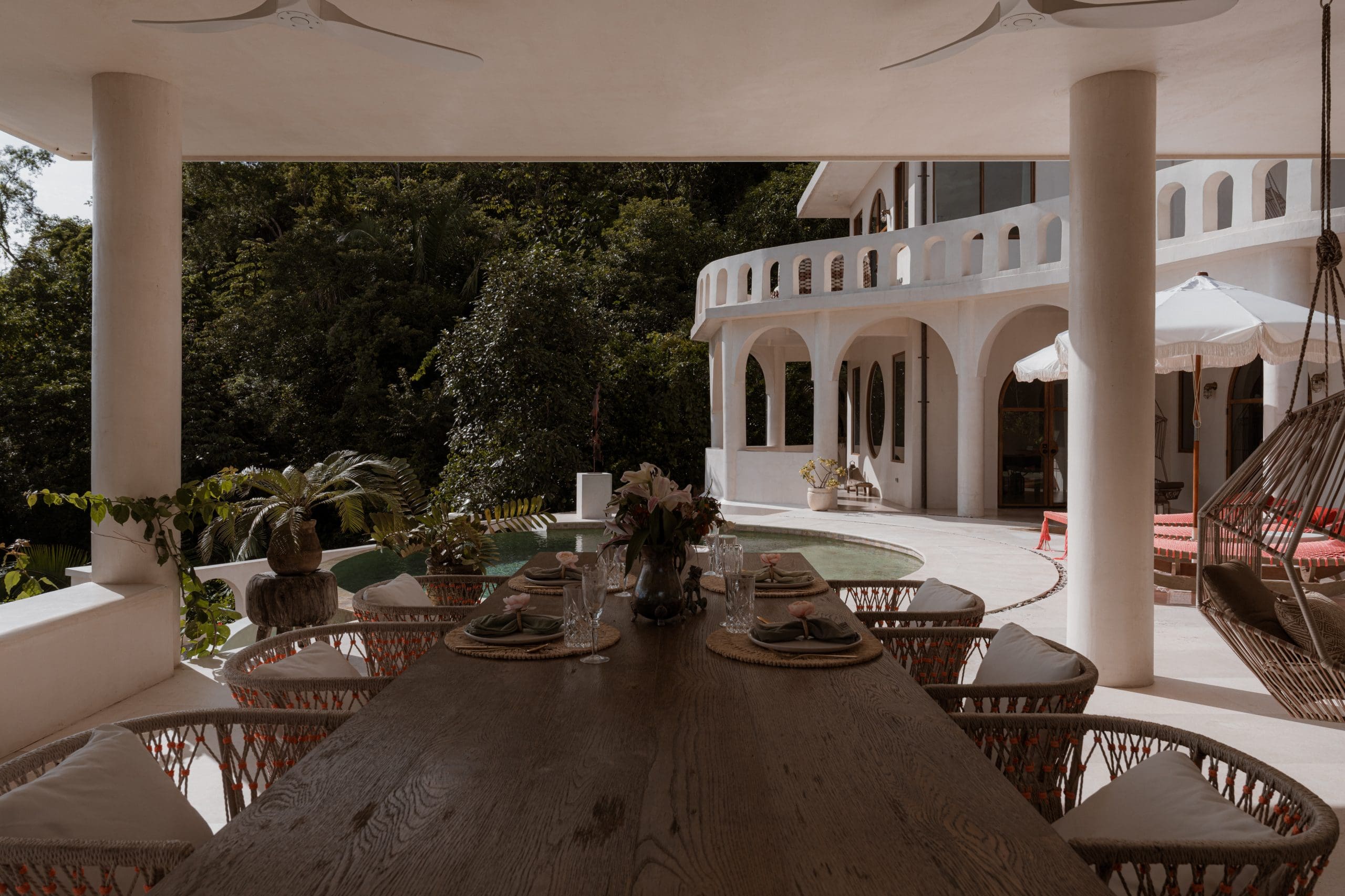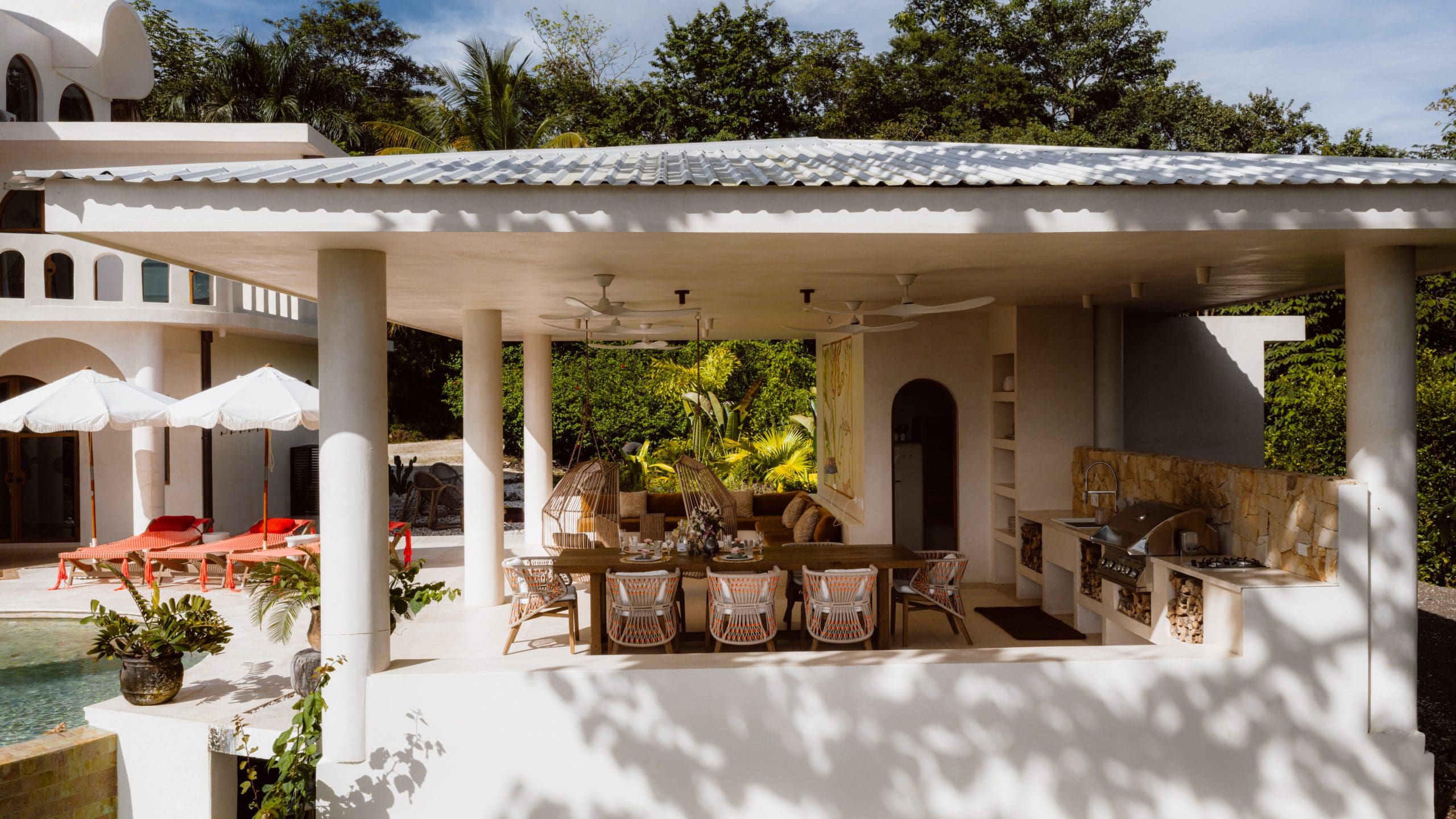 The kitchen balances function with refinement. Premium appliances, dual double ovens, a wine refrigerator, and a breakfast banquette anchor the space. 4 bedroom suites offer ensuite baths and private balconies. The main living area converts seamlessly into a fifth bedroom. Outdoors, a newly added pool and pool house anchor the experience. A communal table for sixteen sits at the heart of the space. A full outdoor kitchen, BBQ, lounge area, and fire pit create an ideal setting for evenings under the stars.