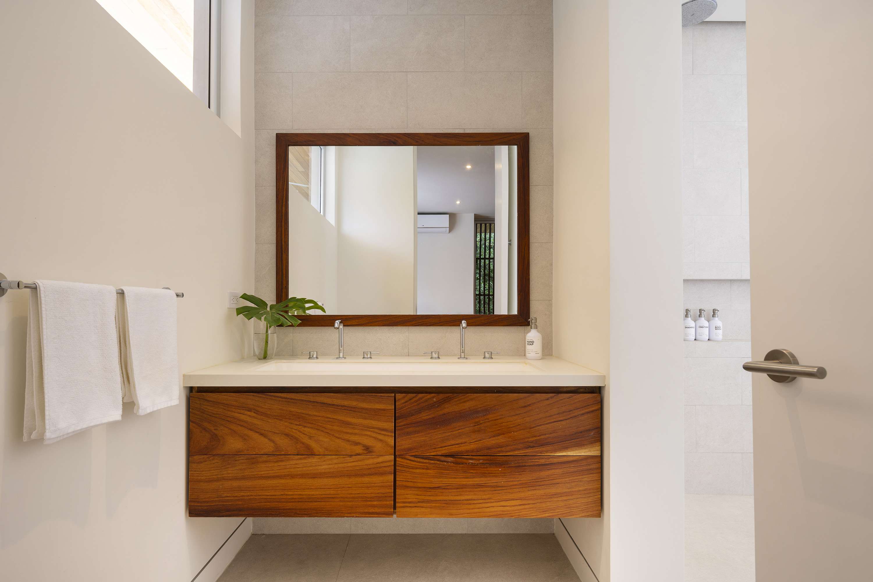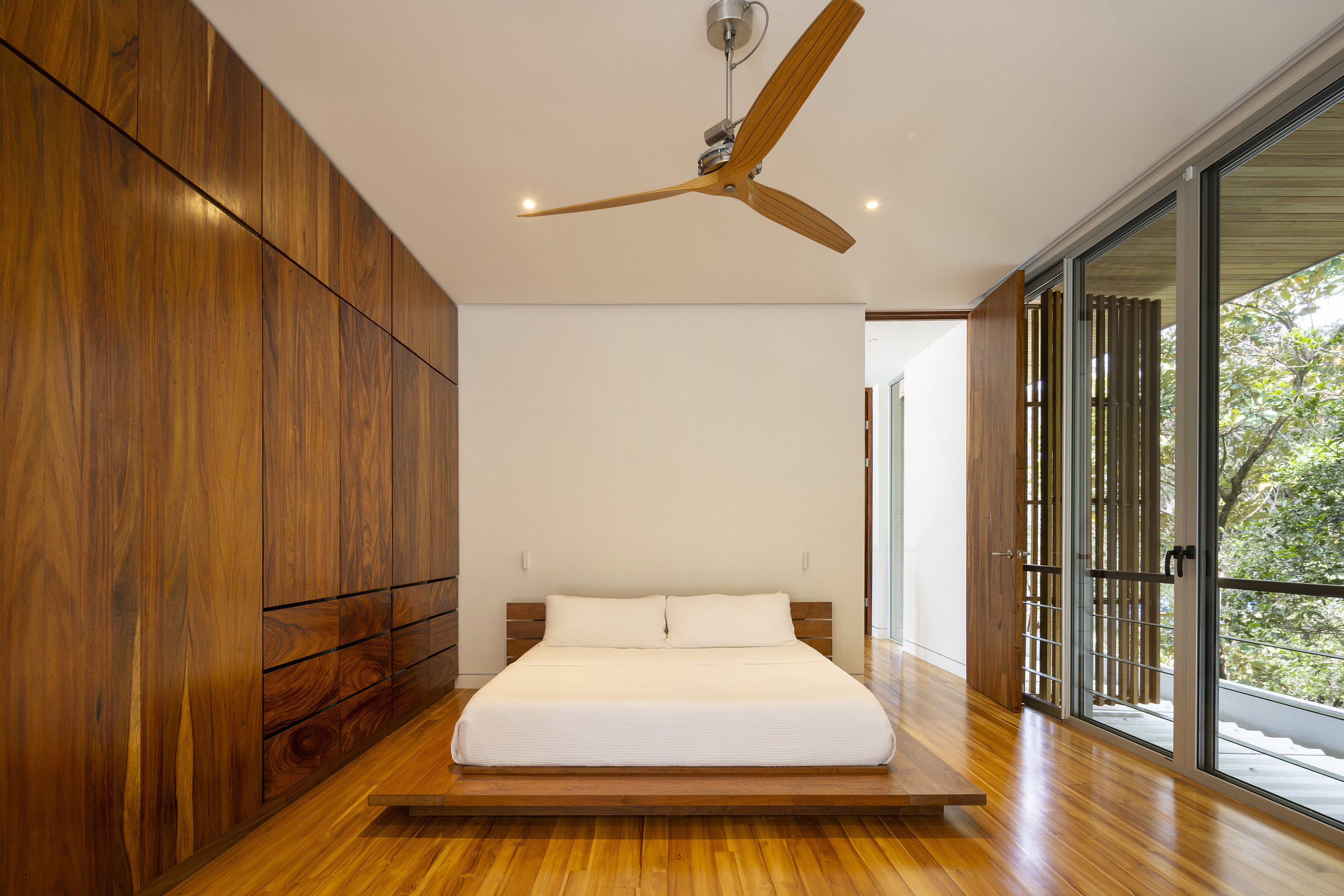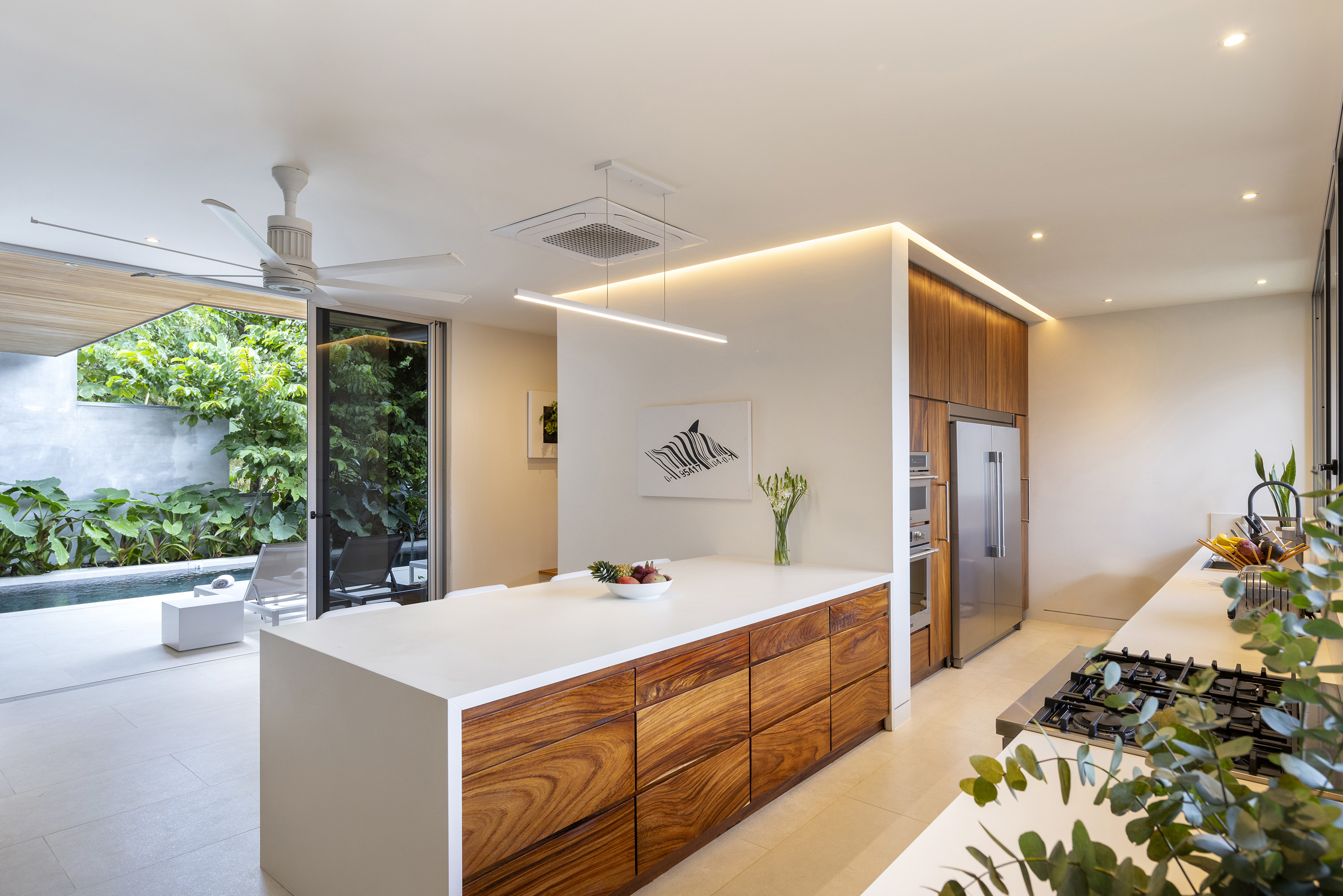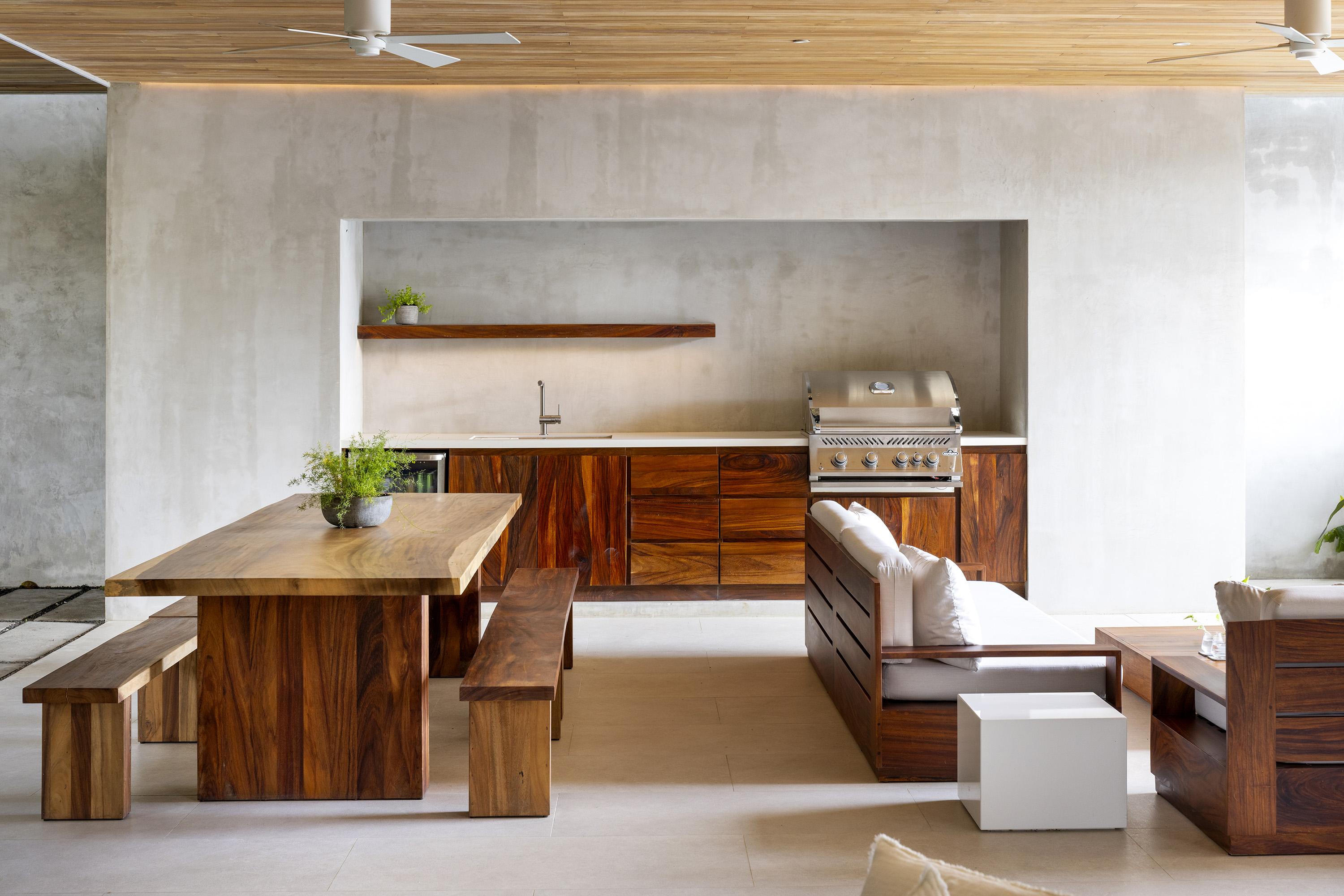 The main residence occupies the second and third levels, where the pool and covered patio create an ideal space for relaxing or entertaining. The professional-grade kitchen and living area open directly onto the patio, creating expansive indoor–outdoor living. A massive custom single-slab wood table sits just off the kitchen for dining in air-conditioned comfort, with a second table located on the patio by the pool. All the stunning Guanacaste wood used for the tables and cabinetry was sourced from a tree on the property. The kitchen would make any chef jealous.
