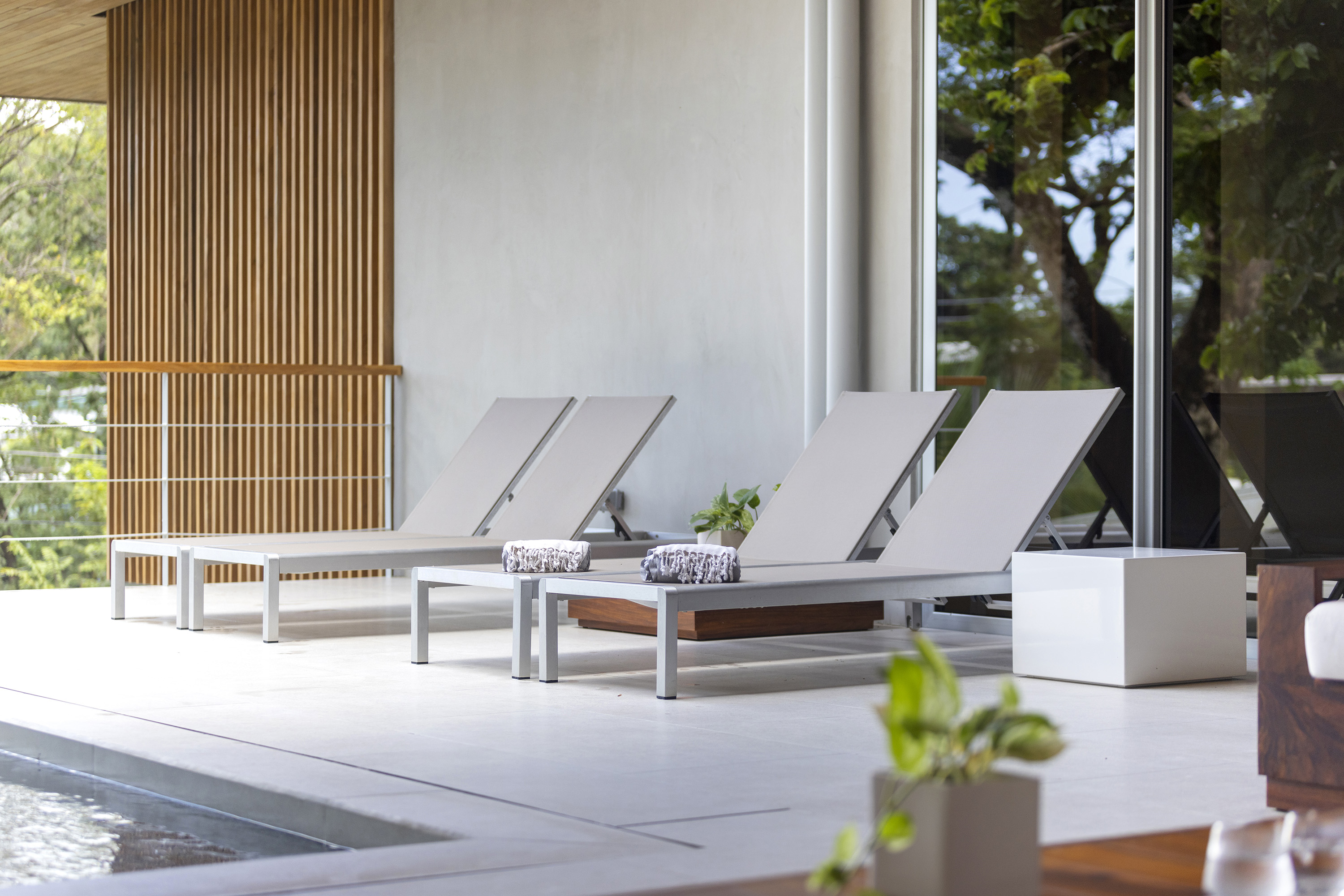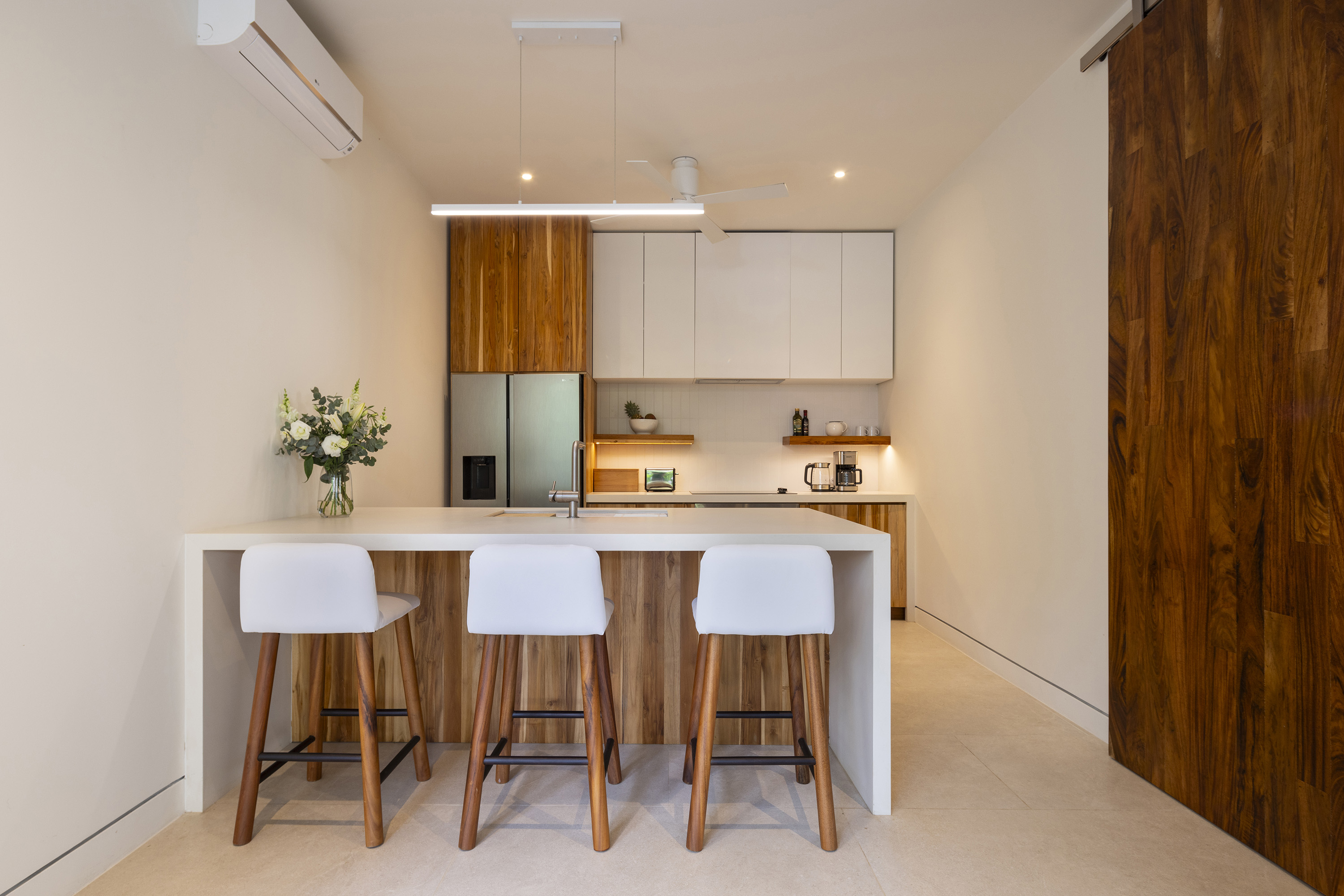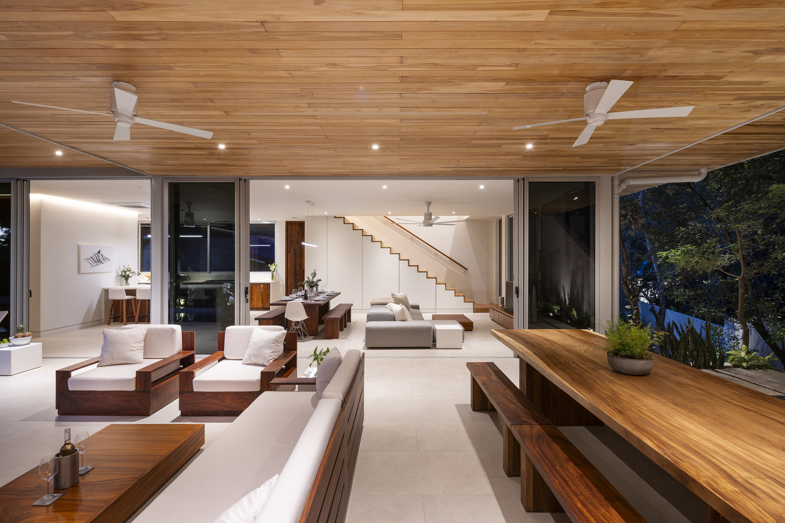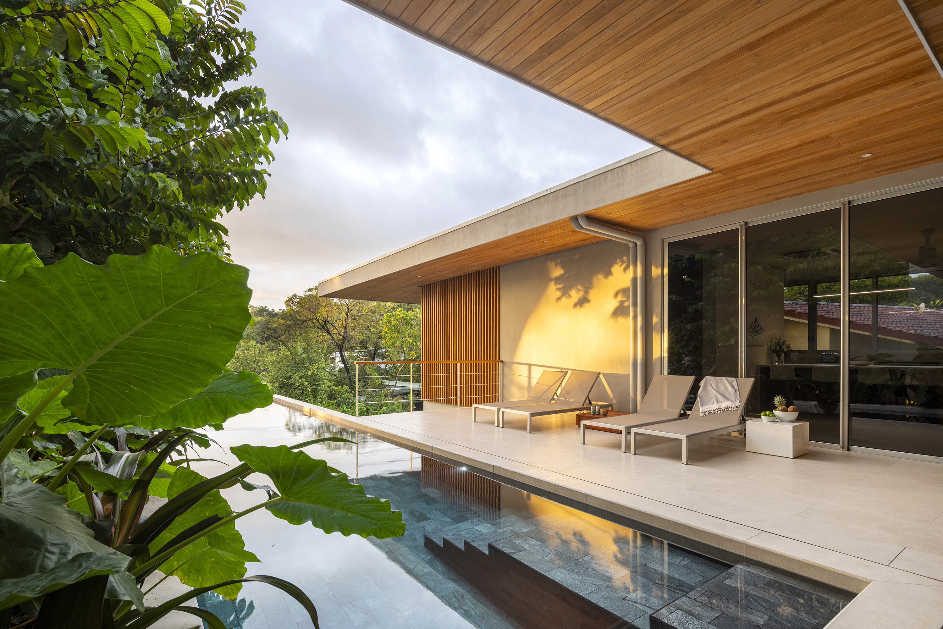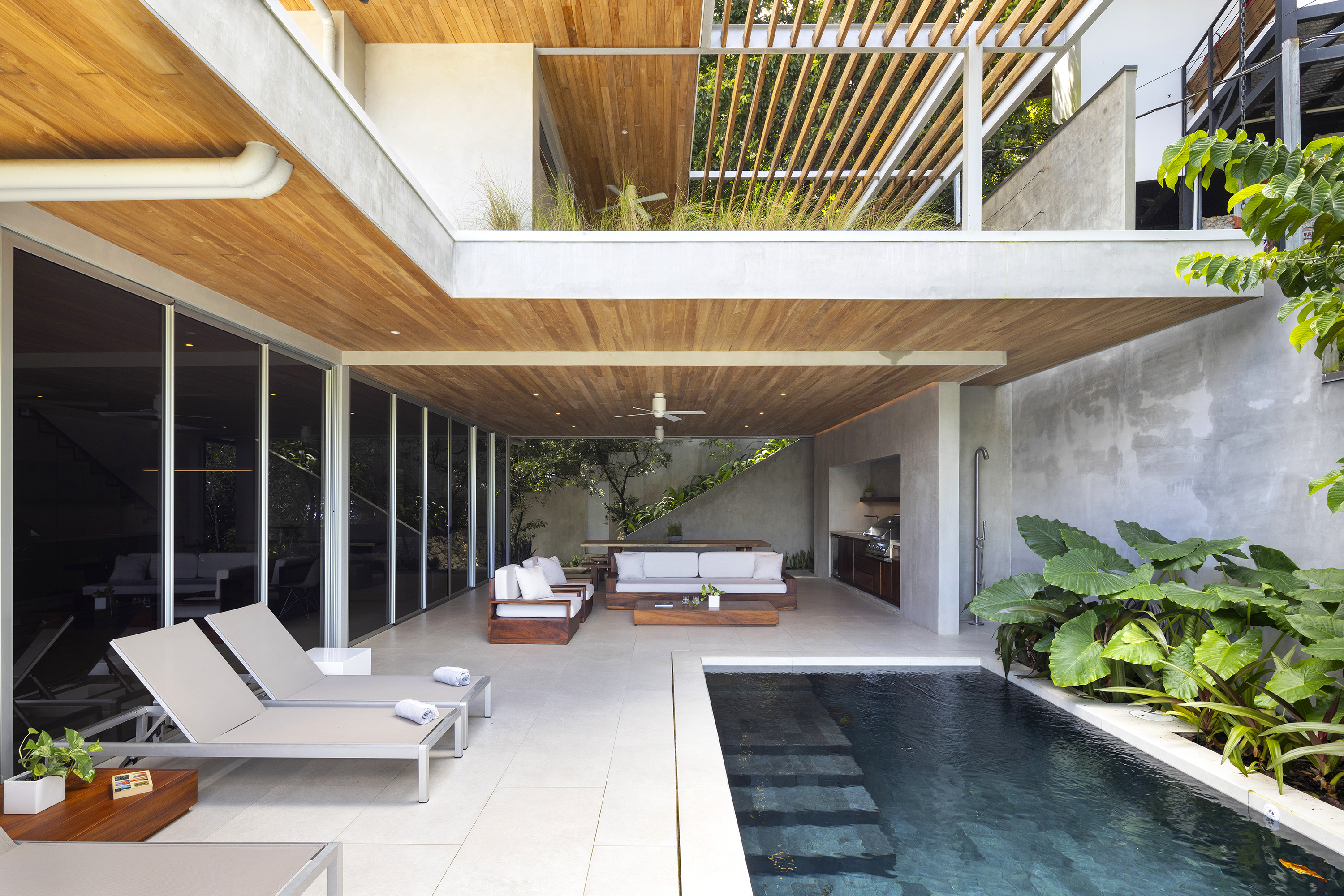 The main residence occupies the second and third levels, where the pool and covered patio create an ideal space for relaxing or entertaining. The professional-grade kitchen and living area open directly onto the patio, creating expansive indoor–outdoor living. A massive custom single-slab wood table sits just off the kitchen for dining in air-conditioned comfort, with a second table located on the patio by the pool. All the stunning Guanacaste wood used for the tables and cabinetry was sourced from a tree on the property. The kitchen would make any chef jealous.