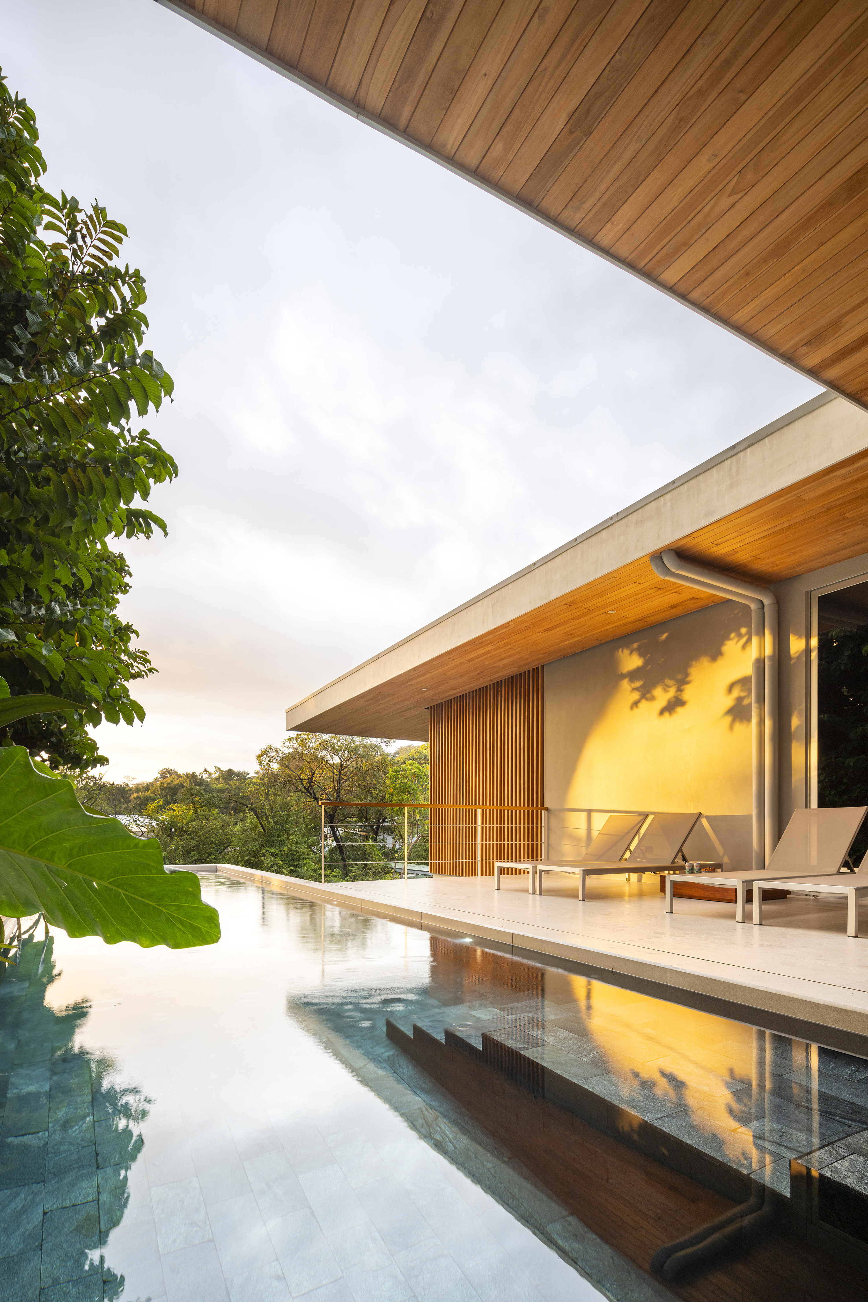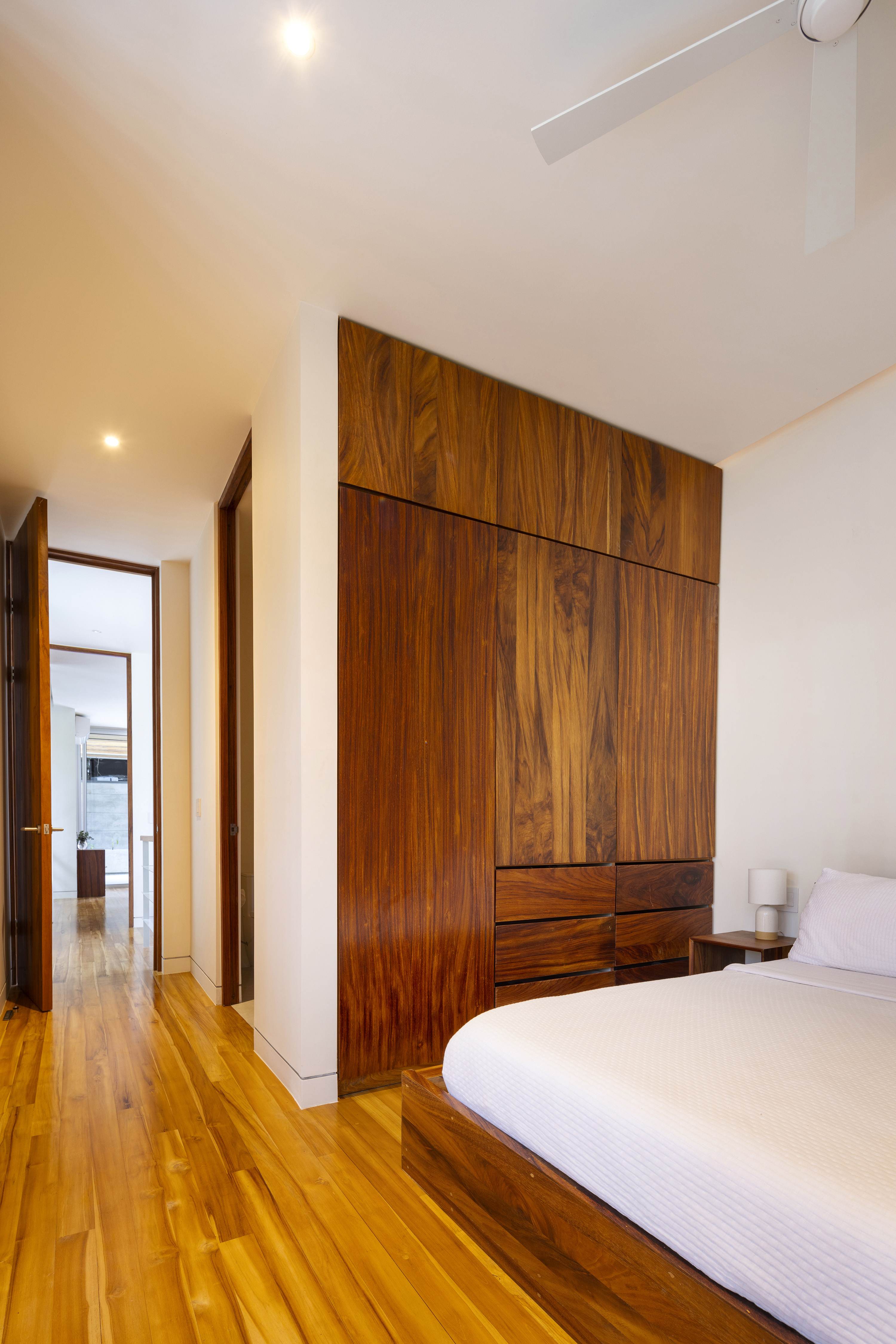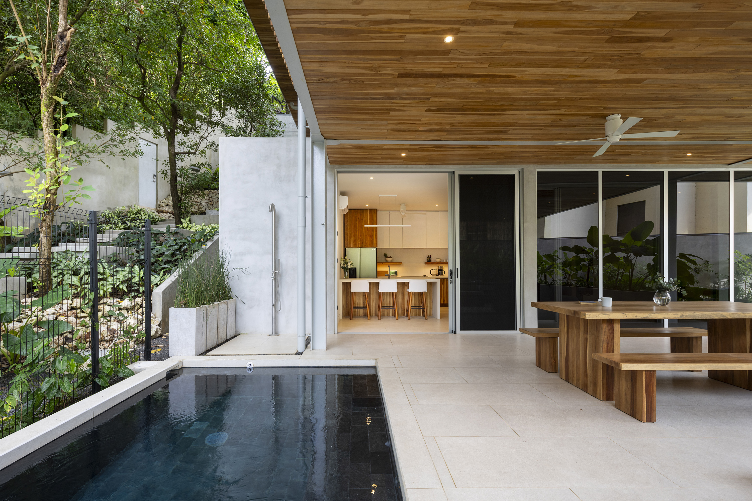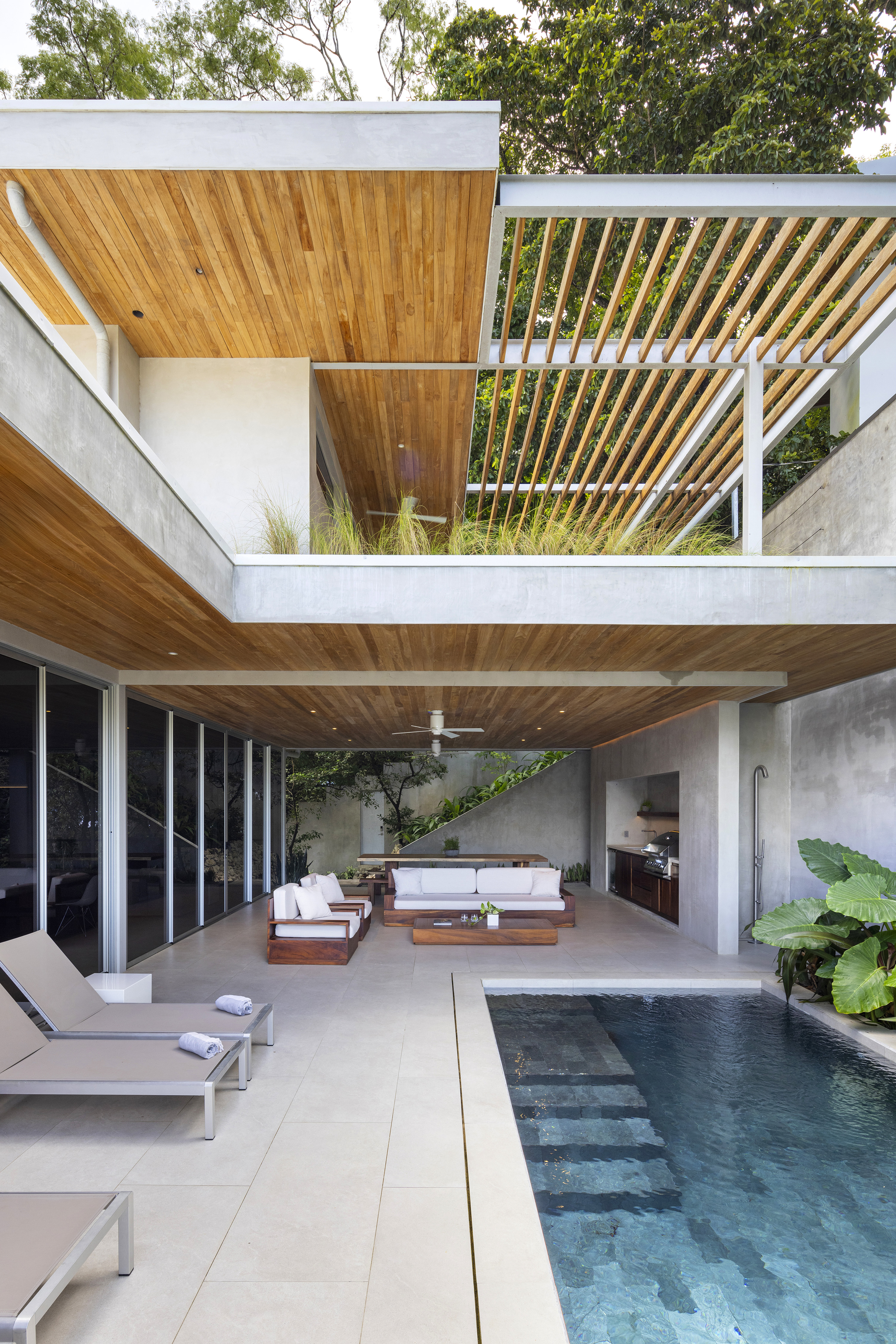 The main residence occupies the second and third levels, where the pool and covered patio create an ideal space for relaxing or entertaining. The professional-grade kitchen and living area open directly onto the patio, creating expansive indoor–outdoor living. A massive custom single-slab wood table sits just off the kitchen for dining in air-conditioned comfort, with a second table located on the patio by the pool. All the stunning Guanacaste wood used for the tables and cabinetry was sourced from a tree on the property. The kitchen would make any chef jealous.