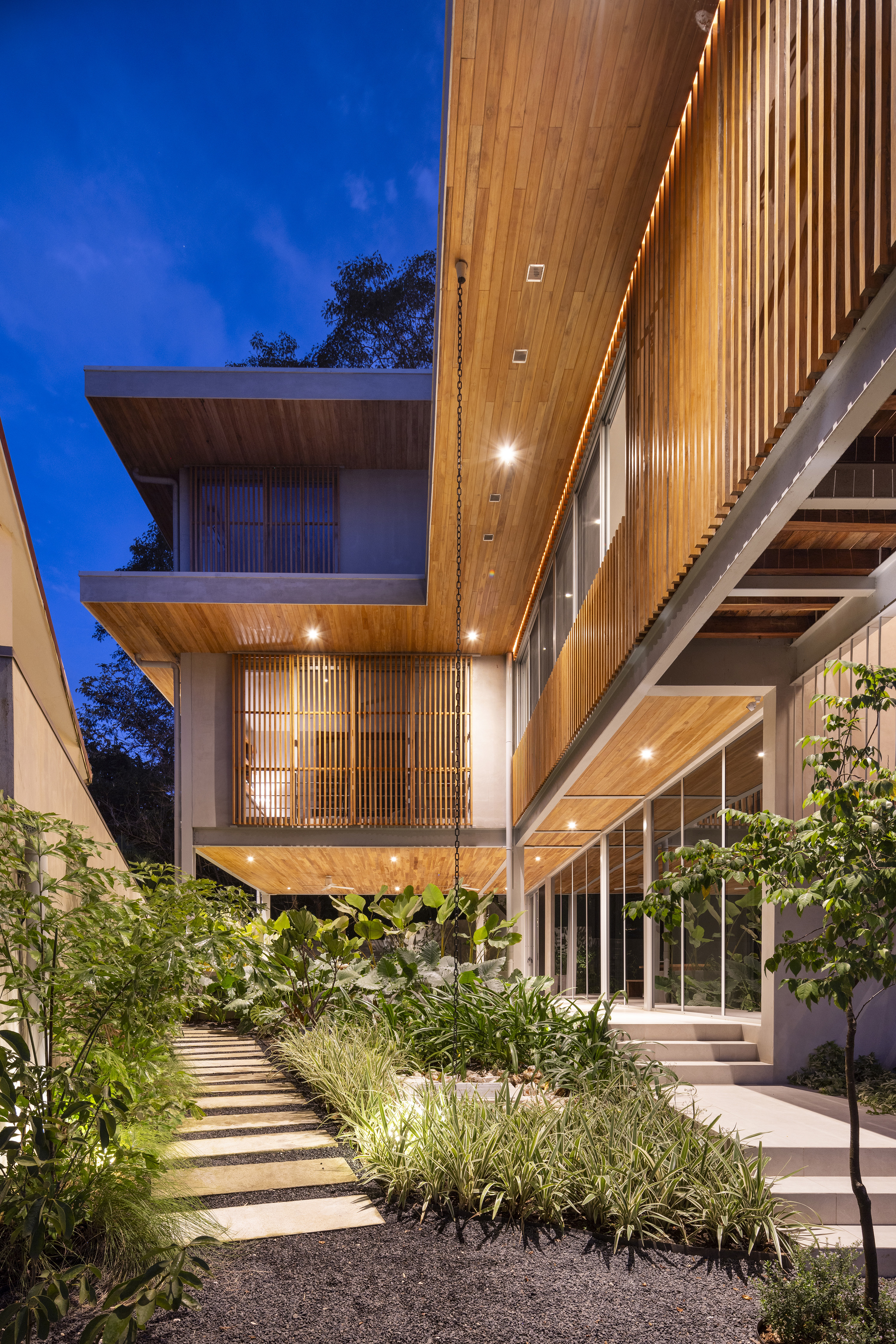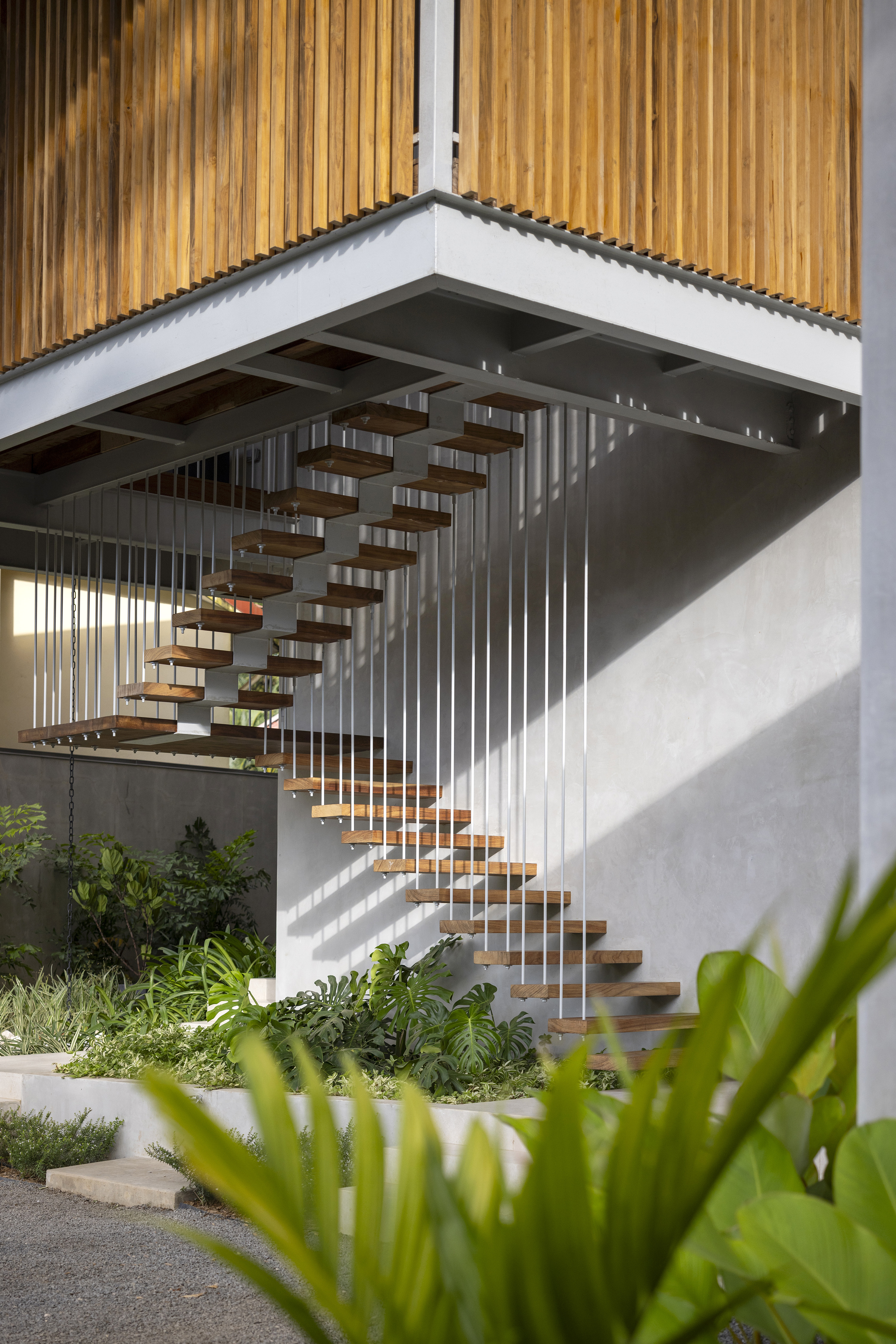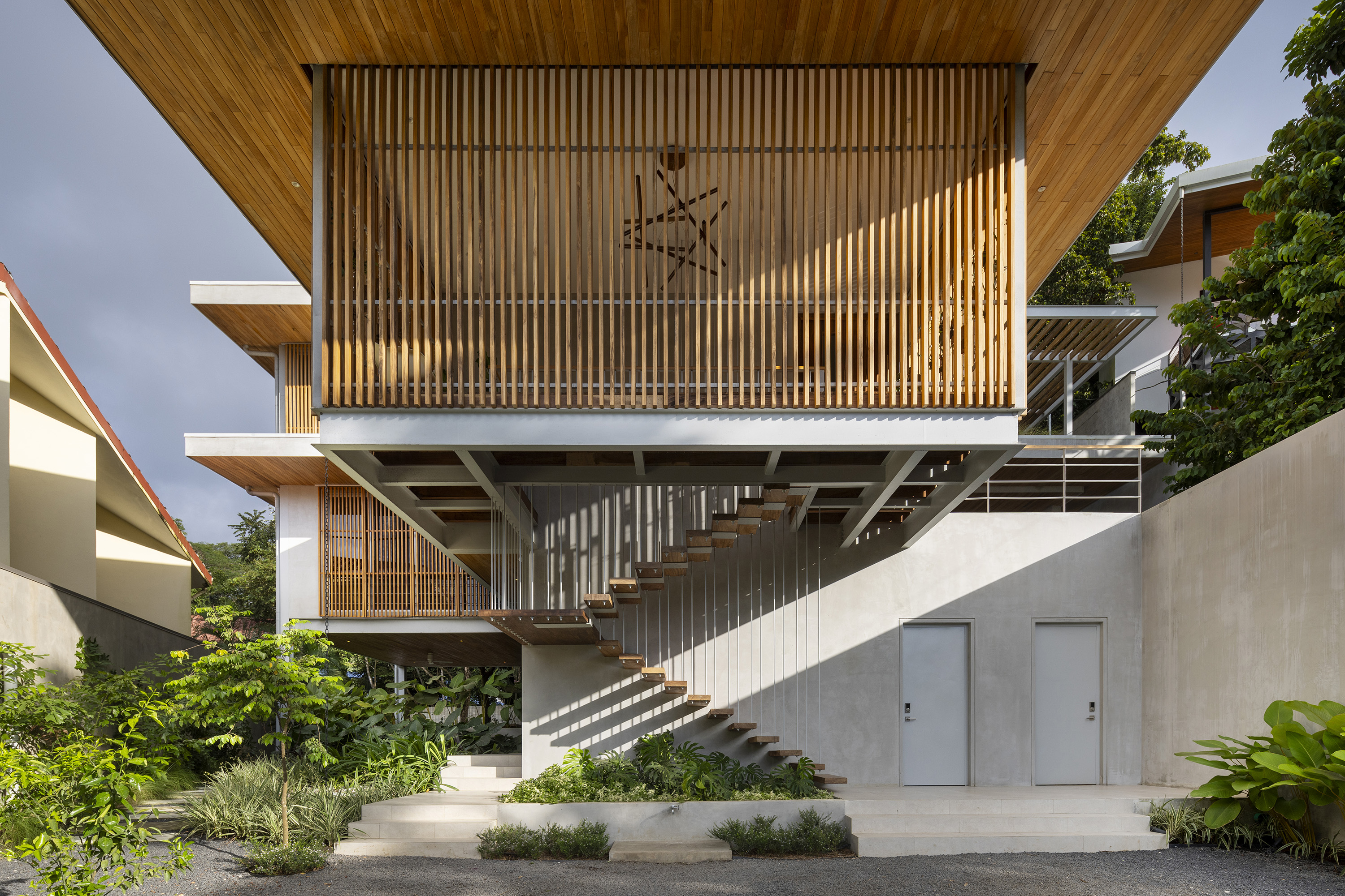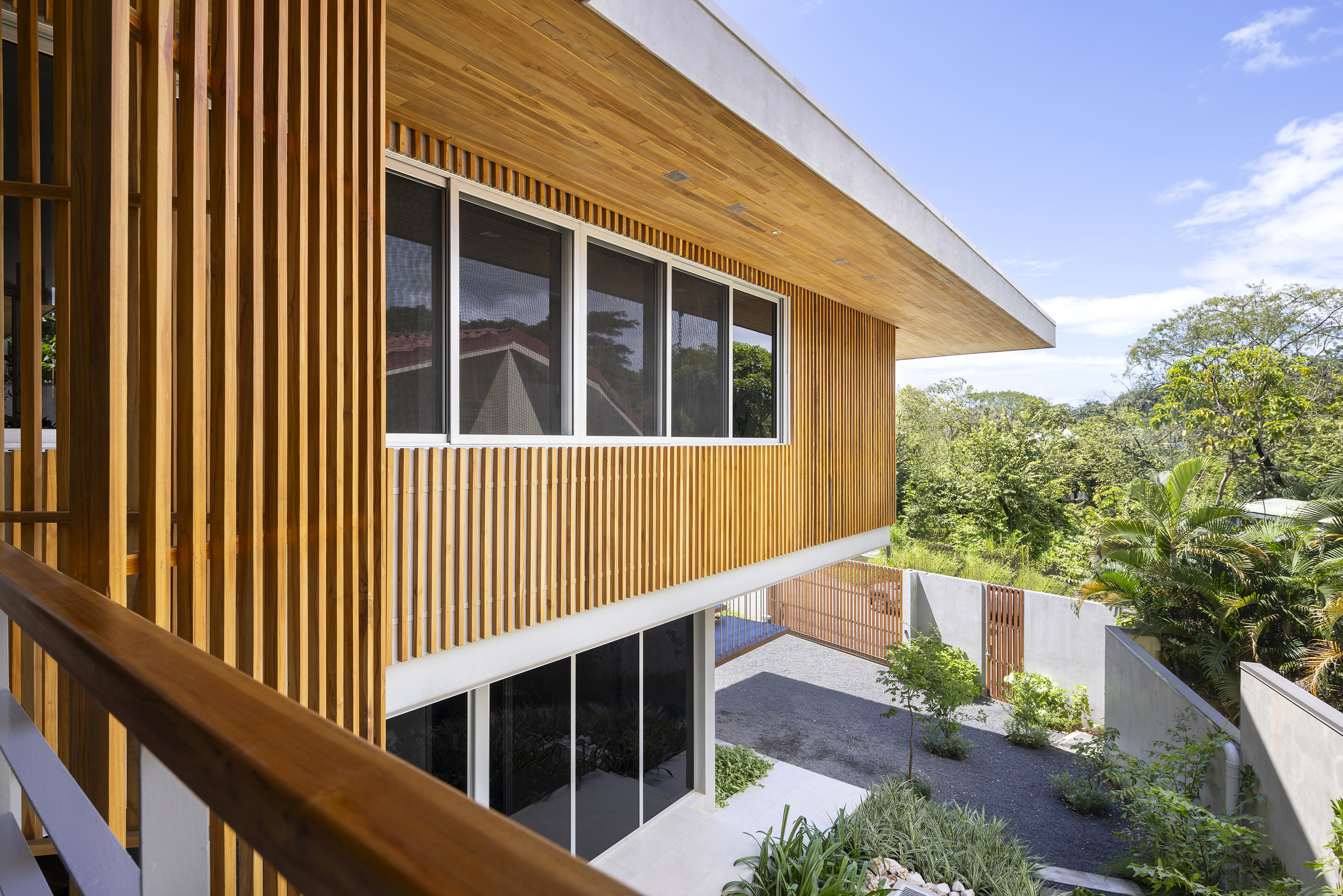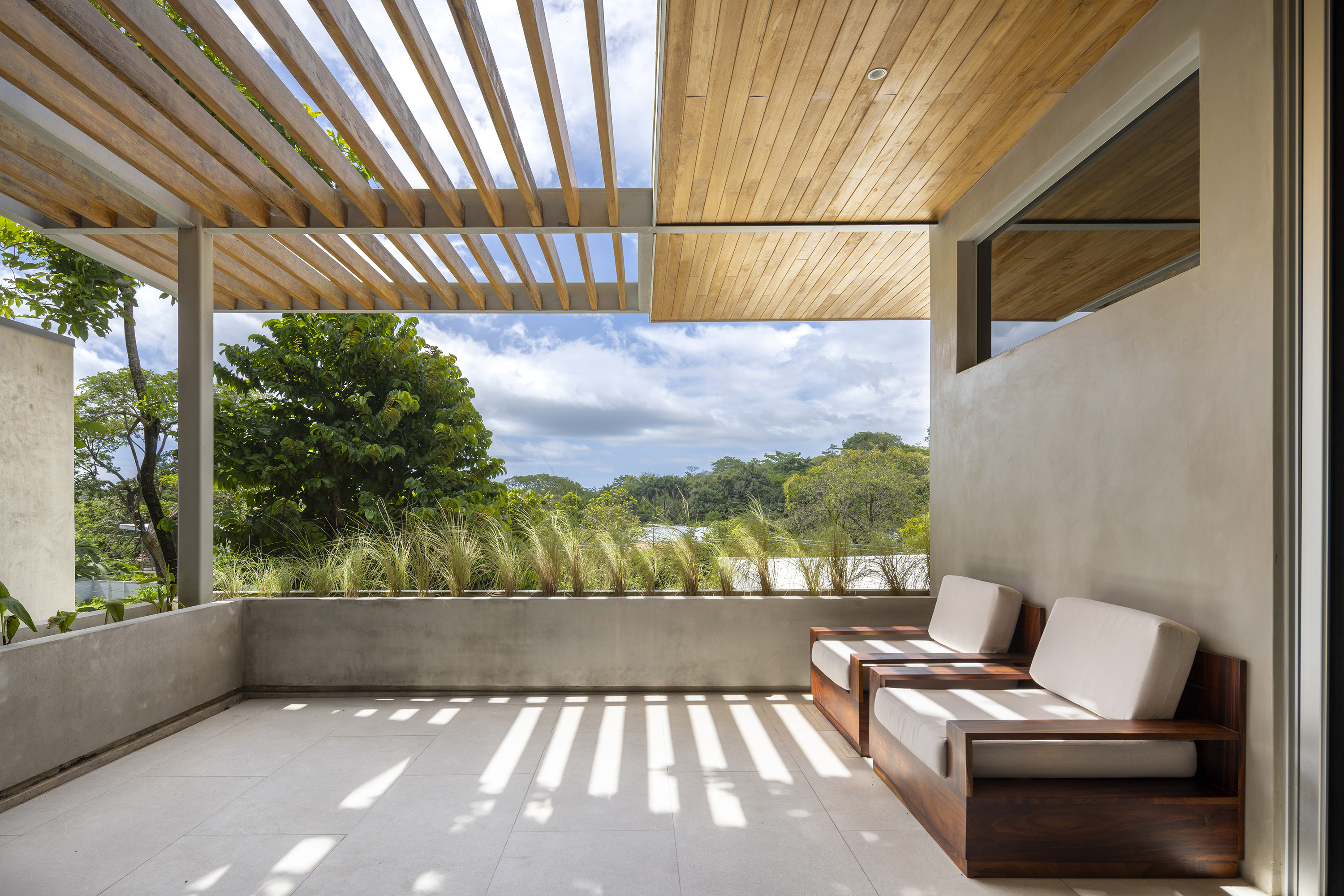 The main residence occupies the second and third levels, where the pool and covered patio create an ideal space for relaxing or entertaining. The professional-grade kitchen and living area open directly onto the patio, creating expansive indoor–outdoor living. A massive custom single-slab wood table sits just off the kitchen for dining in air-conditioned comfort, with a second table located on the patio by the pool. All the stunning Guanacaste wood used for the tables and cabinetry was sourced from a tree on the property. The kitchen would make any chef jealous.