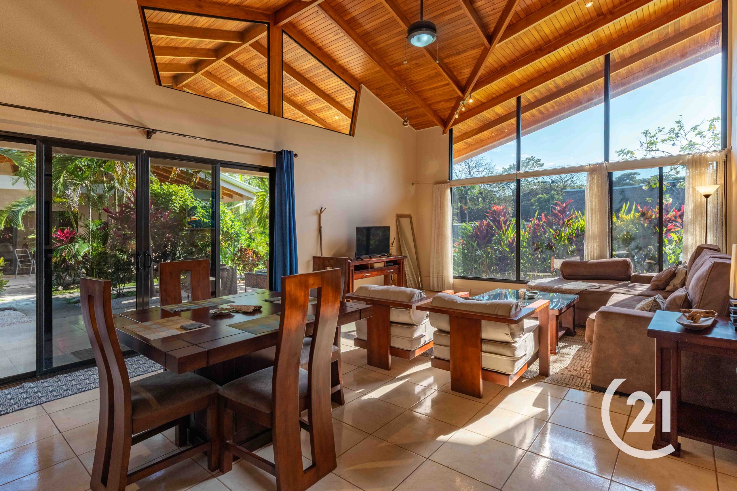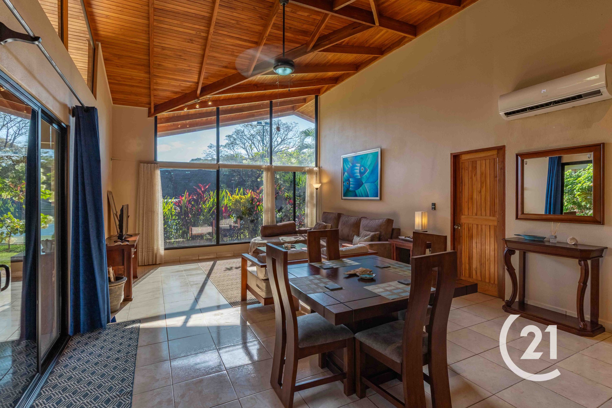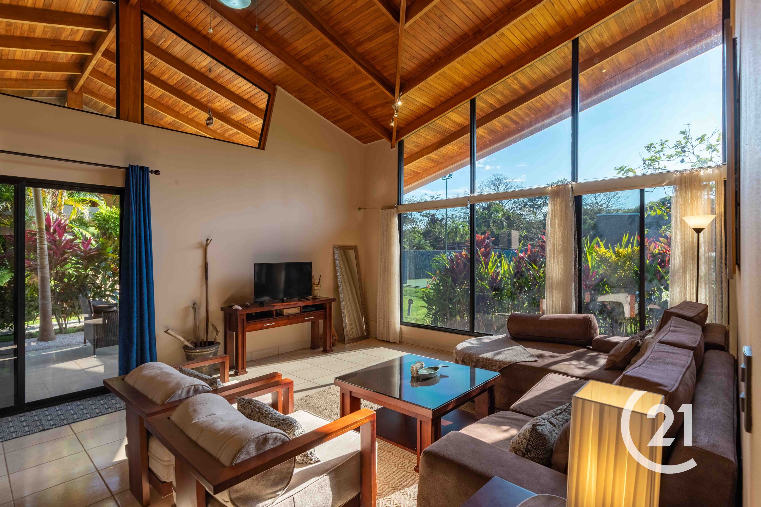 The home has tile flooring throughout, 20-foot vaulted ceilings in the living room, and air conditioning. Windows are treated and polarized, with full-privacy blinds.